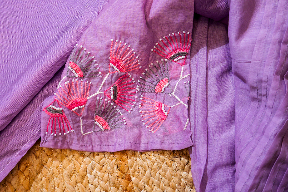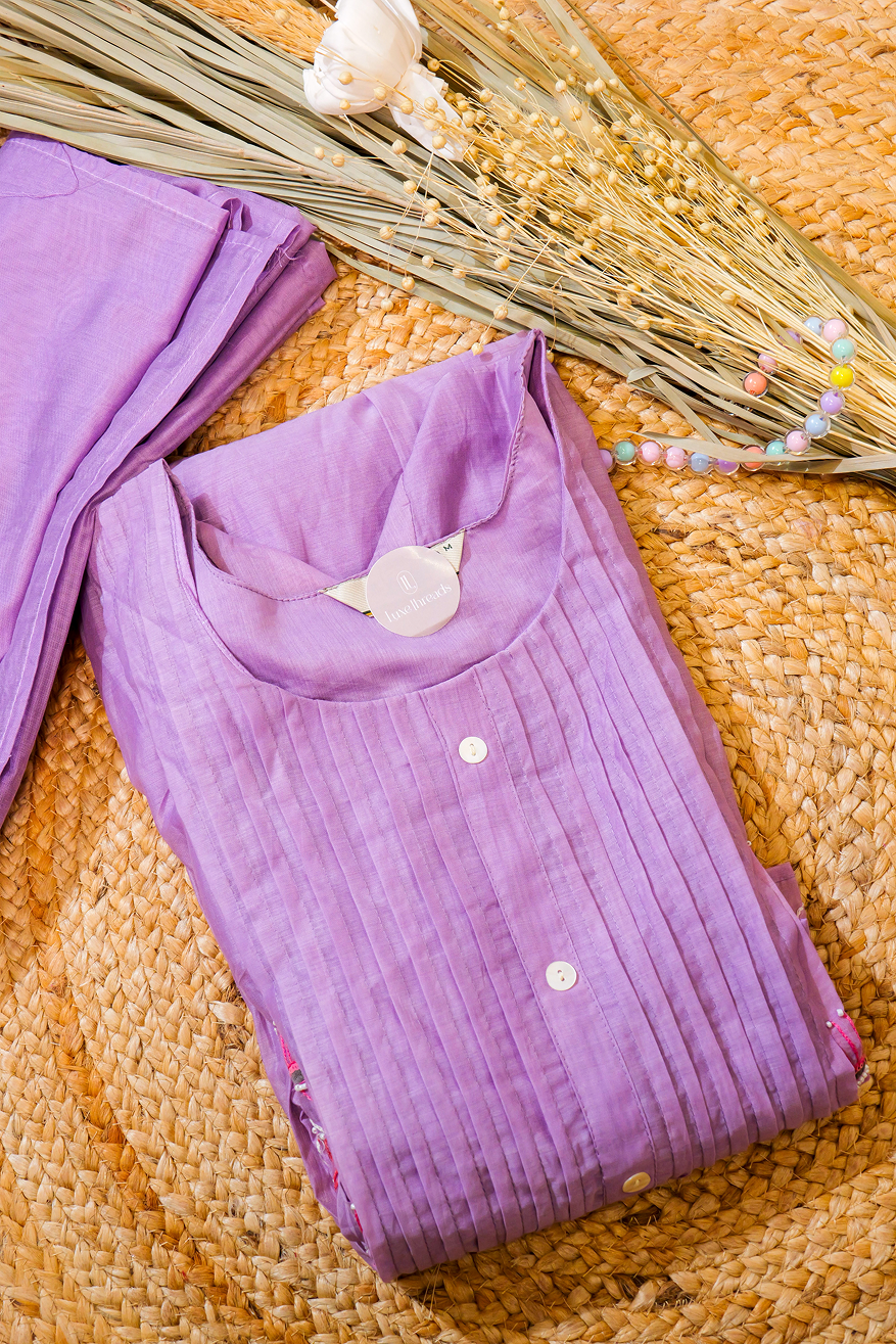 This lavender 3-piece salwar set is made from luxurious Chanderi silk with delicate pleats that add sophistication. The set includes a kurta, bottom, and dupatta. Lightweight and breathable, it is perfectly suited for festive and party occasions, ensuring both comfort and elegance in every gathering.