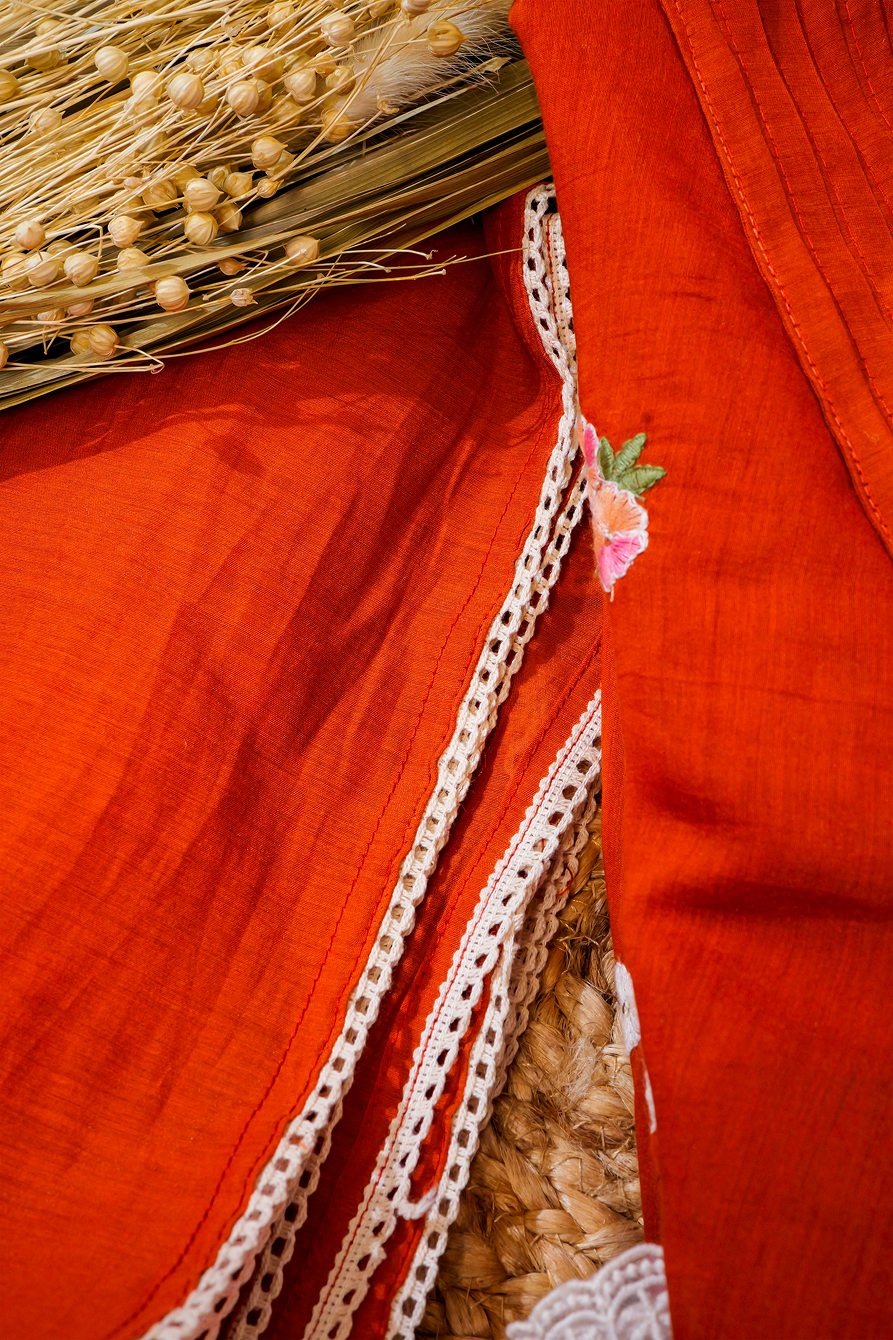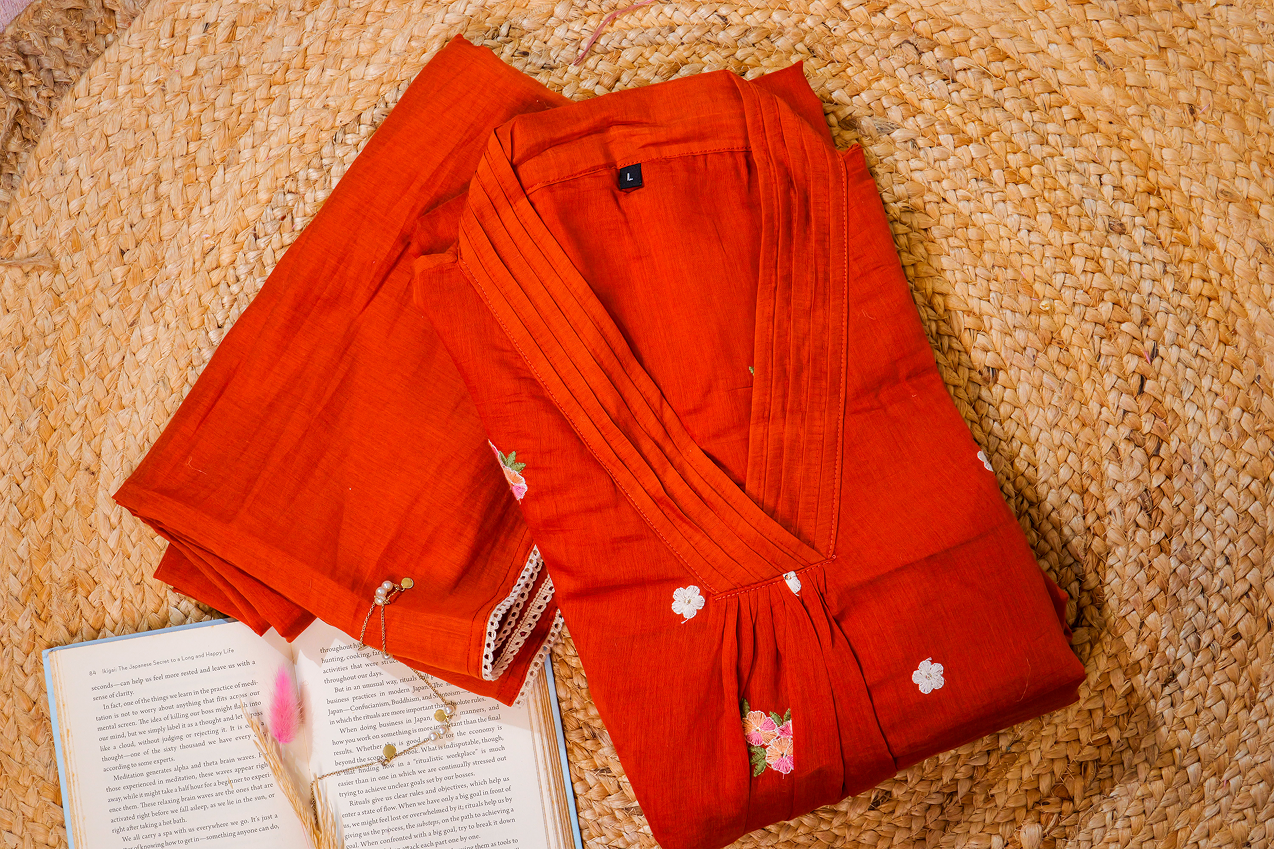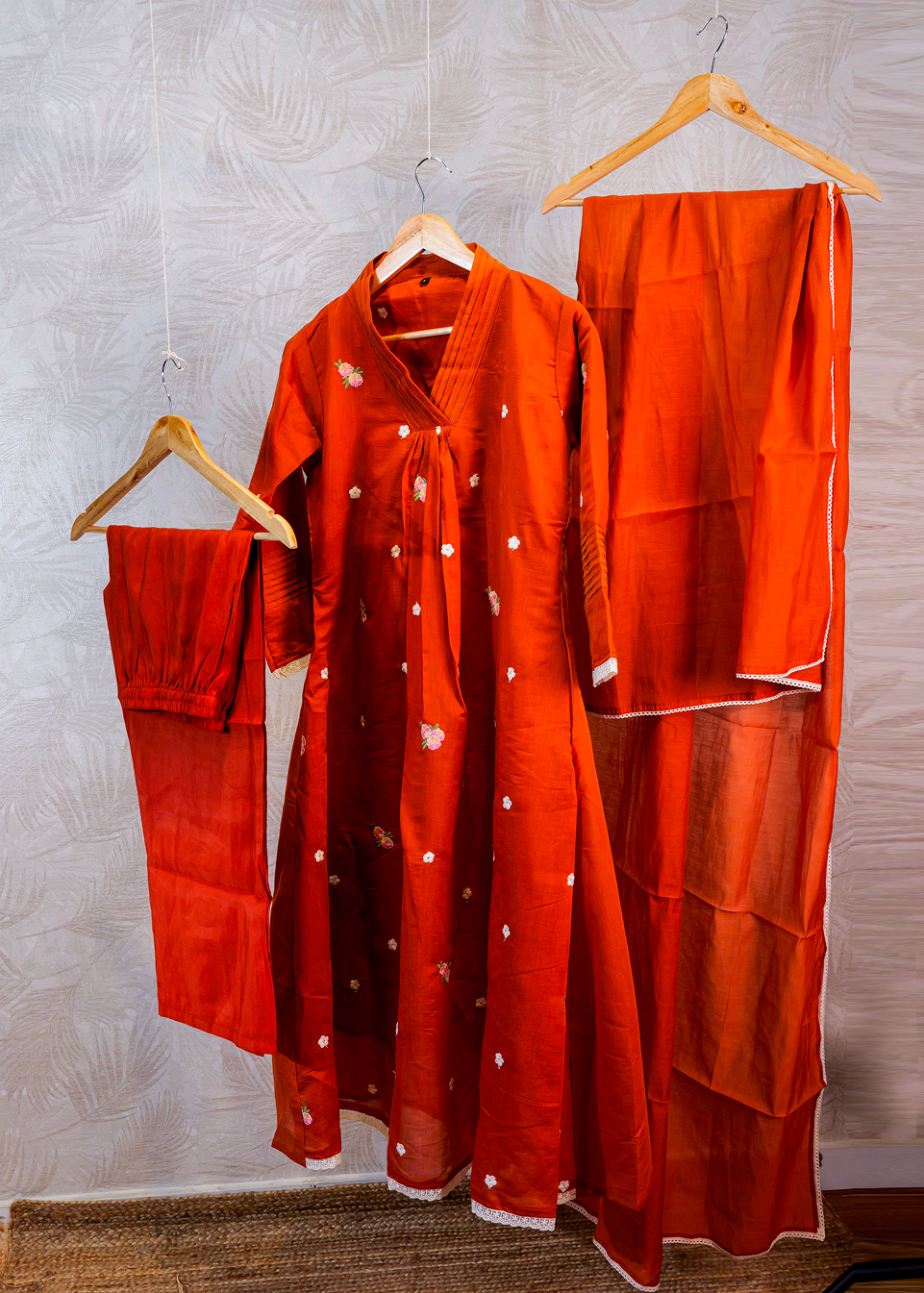 This embroidered 3 piece salwar set in rust orange is crafted from premium chanderi silk, making it an elegant choice for party wear. Designed for both comfort and style, it is a timeless addition to your wardrobe.